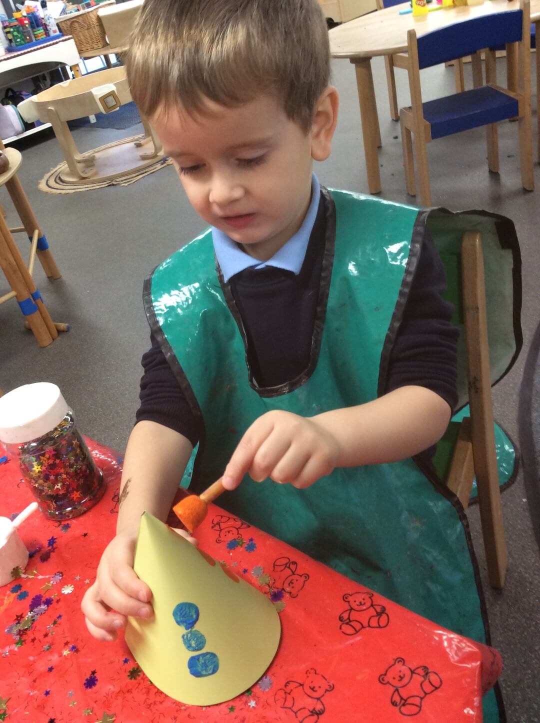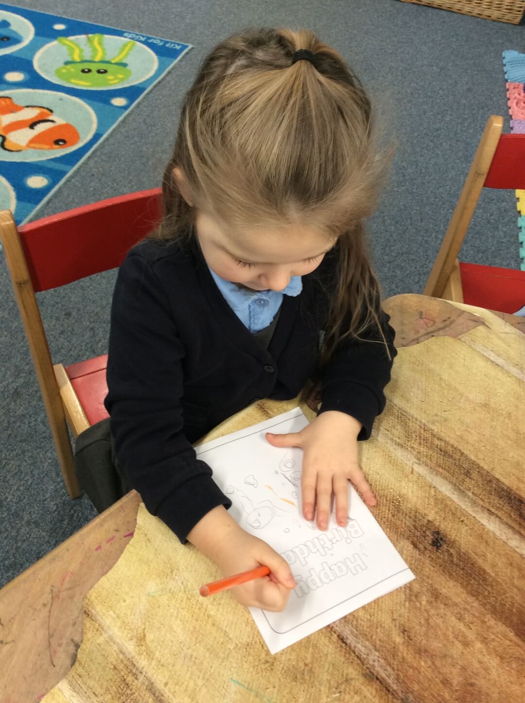 They started by looking at their class birthday board and talking about which month each child’s birthday falls in. The children then enjoyed making their own birthday cards, practising writing their names inside, and getting creative by designing their own colourful party hats.
