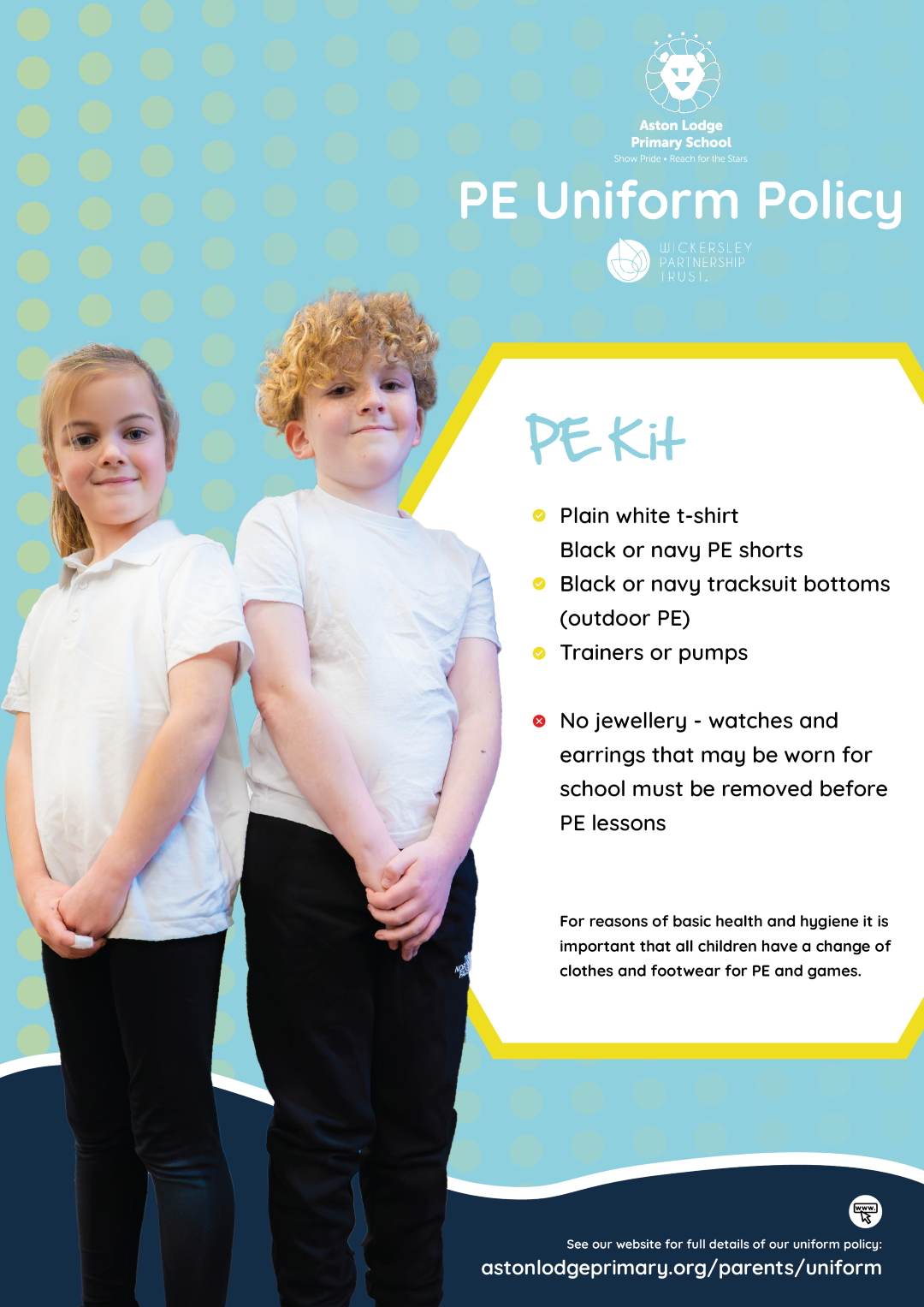 At Aston Lodge Primary School we believe that our children should be able to wear uniform that is affordable. Whilst branded jumpers and polo shirts are available, these are not compulsory and parents/carers are free to purchase uniform from any suitable retailer.